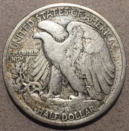 1916-D Walking Half Dollar, Grade= VG, lightly cleaned